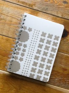 いもくりの入っていた箱を丁寧に分解し、カッティングボードとカッターでノートと同じサイズの 表紙を作り、リング穴を丁寧に開け、もともとのノートの表紙を外し、このSOU・SOUさんデザインの表紙にチェンジしました。