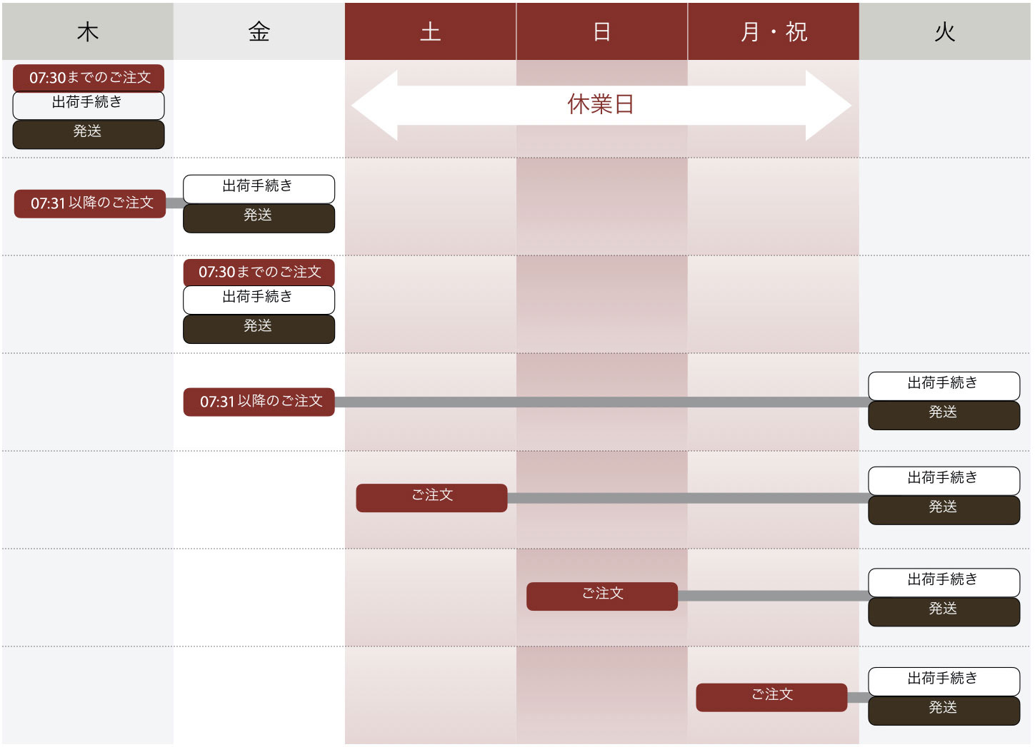 07:31 – 翌日07:30のご注文は、「翌日07:30」の当日(平日)にご注文処理をさせていただきます。ご注文処理後、「受注完了のお知らせ」が送信されます。